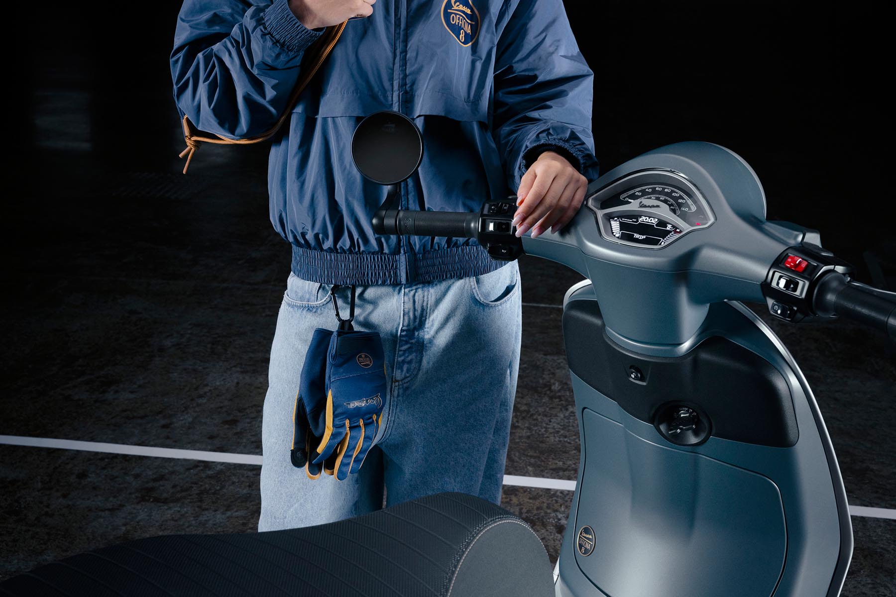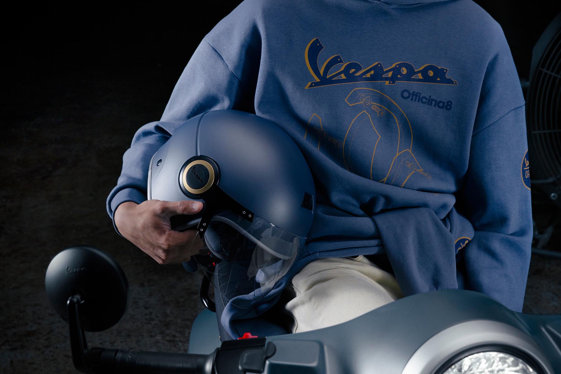 Das Vespa Officina 8 Sortiment an Zubehör und Bekleidung passt perfekt zur Ästhetik des Fahrzeugs.