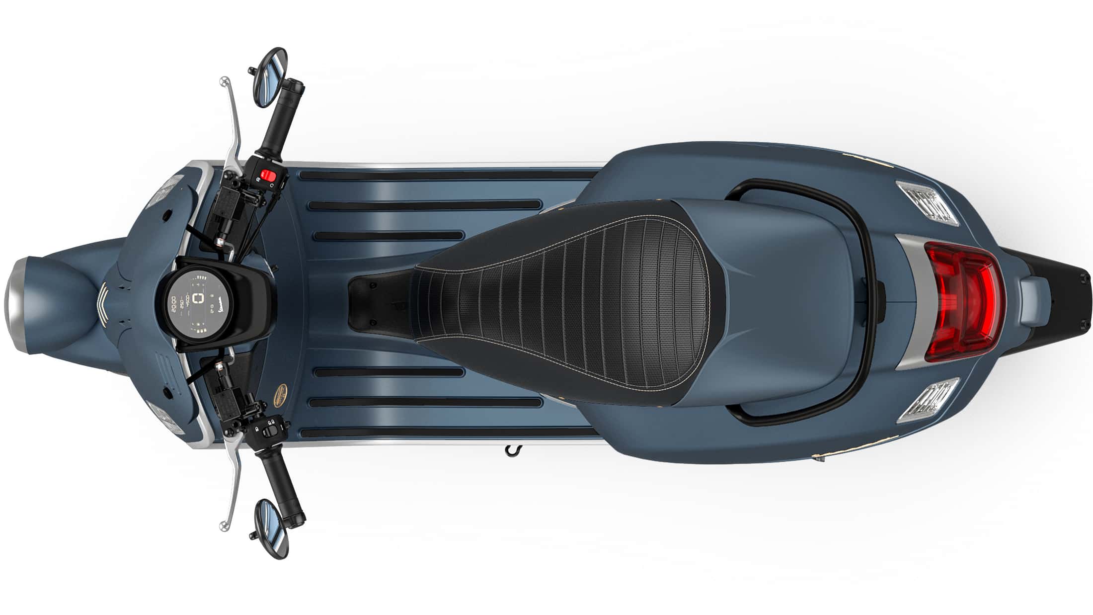 Auch der zweifach gepolsterte Sattel ist mit großer Sorgfalt verarbeitet: Die Sitzfläche mit horizontalen, heißversiegelten Nähten ist von doppelten Kontrastnähten umgeben, während die polierten Messingnieten eine weitere Hommage an die Tradition darstellen. Die Vespa Gtv Officina 8 ist außerdem serienmäßig mit einer Frontverkleidung in der Farbe der Karosserie ausgestattet, die die typischen Verkleidungen der Vespa-Wettbewerbsmodelle widerspiegelt und ihr einen noch sportlicheren Look verleiht.